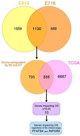 Genes deregulated in cervical cancer and in E6- and E7-expressing cells. Yellow/orange Venn diagram shows the genes deregulated by E616 and E716 in C-33 A stably transfected cells; the intersection of this diagram refers to the 1130 genes significantly modulated by both viral oncoproteins. Orange/pink Venn diagram intersects 335 genes modulated in CC according to the data obtained from TCGA and by the E6 and E7 viral oncoproteins. From these data, a univariate analysis showed 13 genes significantly affecting the OS (p < 0.05). A multivariate analysis demonstrated that PFKFB4 and RIPOR2 genes affected the OS independently of the clinical stage (p < 0.05).