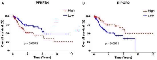 Kaplan–Meier OS analysis according to PFKFB4 and RIPOR2 expressions. Differences in OS of CC patients according to high or low expression of: (A) PFKFB4 (p = 0.0075) and (B) RIPOR2 (p = 0.0011). Low mRNA levels are represented with blue lines and high levels with red lines.