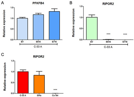 Expression of PFKFB4 and RIPOR2 in CC cell lines. Results obtained by RT-qPCR in C33-E616 and C33-E716 compared to C33-EV for: (A) PFKFB4 mRNA levels; (B) RIPOR2 mRNA levels; and (C) RIPOR2 mRNA levels in CC cell lines C-33 A, SiHa, and Ca Ski. Each graph is a representative experiment from three independently performed. Statistics was performed using GraphPad prism, mean ± SD, Student’s t-test, *** p < 0.0001.