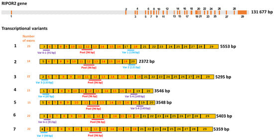 Since few information is available about transcriptional variants of RIPOR2 [37,38], and the primers first used for quantification of RIPOR2 detected all the transcriptional variants (Figure 8), we designed primers to detect the 7 RIPOR2 transcriptional variants (Supplementary Table S1). Due to the similarity among some of the RIPOR2 variants sequences, it was only possible to use specific primers for variants 1, 2, 3, 4, and 7. There are no unique sequences within the exons or in exon–exon junctions distinguishing variants 5 and 6; nevertheless, new primers able to detect variant 5 (and also to detect variant 4), as well as primers detecting variant 6 (and also variant 1) were used. Figure 8 depicts this strategy.