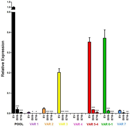 Effect of E616 and E716 oncoproteins on the amount of RIPOR2 transcriptional variants. Expression levels of the 1–7 transcriptional variants were assessed in C33-EV, C33-E616, and C33-E716 cells by RT-qPCR using RIPOR2 pool or specific variant primers. Statistical differences are expressed as *** p ≤ 0.0009, ** p = 0.0029, and * p ≤ 0.0166 when comparing EV vs. E616 or E716 groups.