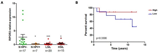RIPOR2 expression in cervical premalignant lesions and cervical cancer. (A) RIPOR2 mRNA levels were analyzed by RT-qPCR using RIPOR2 pool primers in normal (n) HPV positive and negative samples, as well as LSIL and HSIL * p ≤ 0.0222; *** p = 0.0001. (B) Overall survival analysis comparing RIPOR2 low (blue line) vs. high (red line) expression in cervical cancer patients (p = 0.3306).