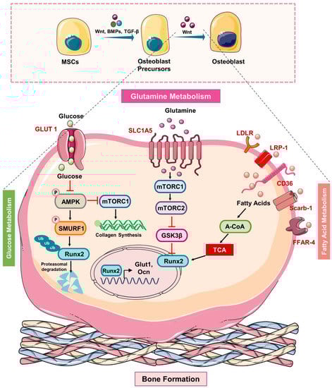 A growing body of evidence points to glycolysis as the primary metabolic process responsible for supplying the significant amount of ATP needed for osteoblast development [12,13]. Glut-1 and Glut-3 are the main glucose transporters that promote the absorption of glucose in osteoblasts lineage cells. Uptake of glucose via Glut is an energy-independent process that transports glucose along a concentration gradient. Recently, Glut-1 was shown to be involved in preventing the AMP-activated protein kinase (AMPK) mediated proteasomal degradation of Runx2 (osteoblast differentiation transcription factor) and demonstrated that the deletion of Glut1 in the osteoblast precursor suppressed its differentiation into mature osteoblasts under both in vitro and in vivo conditions [14] (Figure 2). Additionally, it has been noted that Runx2 is unable to stimulate osteoblast development in the absence of glucose. However, the mechanism underlying Glut-3-mediated glucose absorption and osteoblast differentiation has not yet been studied. In 2017, Lee et al. reported that Wnt signaling promotes glycolysis in osteoblasts via the mammalian target of the rapamycin (mTOR) signaling pathway, whereas parathyroid hormone (PTH) promotes glycolysis via the insulin-like growth factor-1 (IGF-1) mediated signaling pathway. Surprisingly, historical studies have shown that lactate is the final product of glucose oxidation irrespective of the presence or absence of oxygen. According to a recent study, aerobic glycolysis provides 80% of the energy required by osteoblasts, and malic enzyme 2 (Me2) directs glucose carbons to the malate aspartate shuttle to maintain glycolysis [15]. More recently, a study showed that limiting carbohydrates for a short period decreased the levels of circulating bone growth indicators during the resting phase [16]. Together, these studies highlight the importance of glucose metabolism in regulating the differentiation and functional activity of osteoblasts.