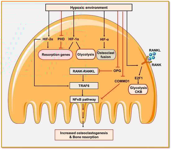 Figure 4. Hypoxia promotes osteoclast differentiation and bone resorption: Osteoclastogenesis is accelerated in hypoxic circumstances. Hypoxia-inducible factors 1α and 2α (HIF-1α and HIF-2α) promote the fusion of osteoclasts. HIF-2α also promotes the expression of TRAF6, enhancing the activation of the NF-κB signaling pathway and maturation of osteoclasts. In addition, hypoxia promotes the activation of NF-κB by reducing the expression of osteoprotegerin (OPG). HIF-1α and HIF-2α, as well as the inhibition of the prolyl hydroxylase domain (PHD), stimulate the production of pro-resorptive genes. Additionally, HIF-1 α is important in promoting glycolytic activity either directly or via negatively regulating the expression of the copper metabolism domain containing 1 (COMMD1) gene. Hypoxia also activates RANK-RANKL signaling that, by promoting the expression of elongation transcription factor (E2F), induces glycolysis and thus enhances the differentiation of osteoclasts along with its induced bone resorption activity.
