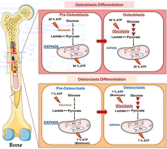 Figure 6. Osteometabolism (Metabolism of Bone Cells): In precursors form, osteoclast and osteoblast cells obtain maximum energy from oxidative phosphorylation whereas in mature form these bone cells obtain energy predominantly from glycolysis.