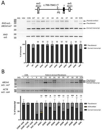 AON-based rescue for the deep-intronic c.769-784C>T variant in two cellular models. Analysis of splicing correction by RT-PCR upon AON delivery. (A) The midigene carrying the c.769-784C>T variant and control midigene were transfected in HEK293T except for the endogenous HEK293T expression control (HEK). The nine AONs and SON were co-transfected to cells expressing the midigene carrying c.769-784C>T variant and were labelled from A1 to SON. The AON-not transfected wells identified as control (CON) and mutant (MT) were used as a reference for splice correction. The genomic region of the used midigene is represented on top of the RT-PCR result. The graph below represents the semi-quantification of the resulting RT-PCR products, showing the percentage of correct and PE inclusion transcript. Statistically significant PE exclusion was achieved for 7/9 AONs. MQ shows the negative control of the PCR reaction, and amplification of exon 5 of RHO gene was used as a transfection control. Data (n = 2) are presented as mean ± SD (ns: not significant, * p < 0.05, ** p < 0.01). (B) The same nine AONs and SON were tested in patient-derived fibroblasts. AONs and SON were transfected to patient-derived fibroblasts carrying the c.769-784C>T variant and were labelled from A1 to SON. To control nonsense-mediated decay (NMD), cells were grown either in presence (+) or absence (−) of CHX. The AON-not transfected control (CON) and patient-derived fibroblasts were used as a reference point for splicing-correction. The graph below represents the semi-quantification of the resulting RT-PCR products, showing the percentage of correct and PE inclusion transcript. Statistically significant PE exclusion was achieved for 5/9 AONs. MQ shows the negative control of the PCR reaction and amplification of exon 3—exon 4 of ACTB gene was used as a loading control. Data (n = 3) are presented as mean ± SD and compared to the AON-untreated condition (ns: not significant, * p < 0.05, ** p < 0.01.