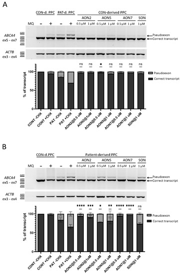 Patient-derived iPSCs were differentiated into PPCs using a 30-day long protocol. The successful differentiation of the cells was assessed by qPCR. The results showed an increase of expression of retina-specific genes and emphasized ABCA4 expression compared to day 0 iPSCs (Figure S4A–D). Similar to the patient-derived fibroblasts, the PE was visualized through the inhibition of the NMD pathway via CHX treatment. AON-driven splicing correction was achieved by gymnotically delivering AONs at day 28 of differentiation at two concentrations, 0.5 µM and 1 µM. Both ABCA4 control and c.769-784C>T cell lines were exposed to the treatment. SON was delivered simultaneously with the AONs at 1 µM in the same manner. The RT-PCR results were confirmed with Sanger sequencing (Figure S1C). As observed in the two previous experiments, a small degree of PE inclusion was found in the CHX-treated line expressing ABCA4 wild-type sequence (5% PE inclusion). PE insertion in the CHX-treated mutant line represented 34% of the total transcript. Statistically significant PE exclusion was achieved with all AONs at both concentrations (p < 0.05). AON2 delivered at 0.5 µM and AON7 delivered at 0.5 µM and 1 µM were the most potent, whereas AON5 delivered at 0.5 µM was the least efficacious (Figure 3). Inter-efficacy comparison of AON2 at 0.5 µM and 1 µM showed that AON2 performed slightly better at the lower concentration, while the same analysis for AON7 showed the difference in efficacy between the two concentrations is negligible. In the control PPC line, the residual expression of the PE was detected by RT-PCR and semi-quantified using Fiji software. In the not-treated control line, the PE represented 5%. After the AON treatment, the PE expression represented between 3% to 5% (Table S2) of the total transcript. Splicing aberrations in the control PPC line due to exposure to any of the AONs were not observed.