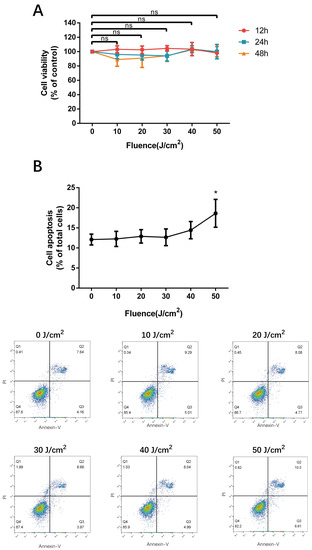 The effect of 590 nm LED irradiation on cell viability and cell apoptosis of HMEC-1. (A) Cell viability of HMEC-1 measured using CCK-8 assay 12 h, 24 h and 48 h after 0–50 J/cm2 590 nm LED illumination. Results were normalized to the control. (B) Apoptosis of irradiated cells detected by flow cytometry (24 h, Annexin-V FITC & PI staining). Data are presented as means ± SD in independent experiments. n = 3; *, p < 0.05. n.s., no significance.