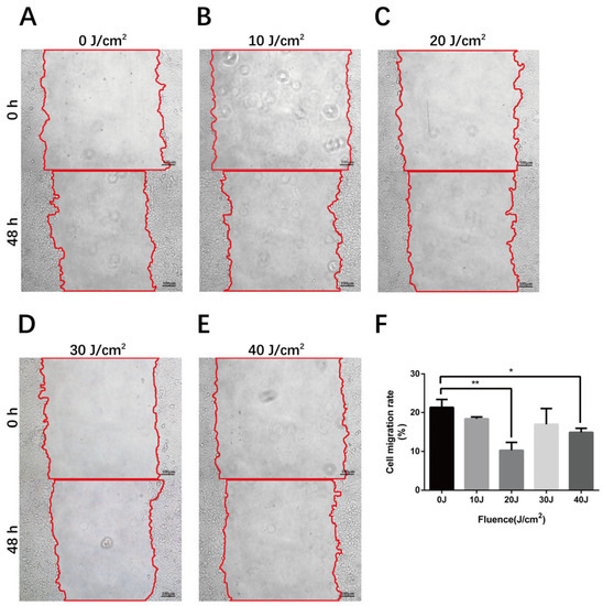 The influence of 590 nm LED on cell migration of HMEC-1. (A–E) The wound healing area 48 h after 0–40 J/cm2 LED irradiation. (F) Cell migration rate 48 h after 0–40 J/cm2 LED irradiation. Results from three independent experiments are presented as means ± SD. *, p < 0.05; **, p < 0.01. Bar, 100 μm.