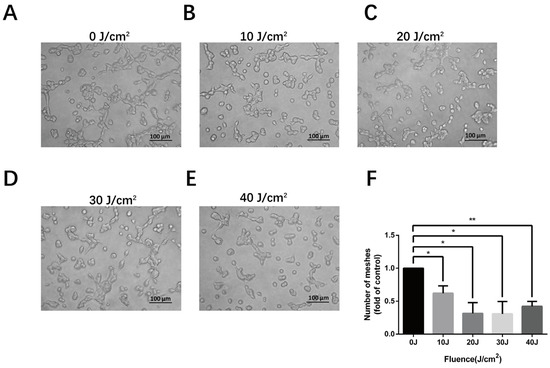 An EC tube formation assay could be used to measure angiogenesis in vitro in a fast, reproducible and quantifiable manner [15]. To observe the tube-forming ability of HMEC-1 irradiated by 590 nm LED, we performed a tube formation experiment to simulate capillary angiogenesis. Our results show that the number of meshes declined markedly after irradiation (0.621 ± 0.112-fold of control, p = 0.028 at 10 J/cm2; 0.314 ± 0.164-fold of control, p = 0.019 at 20 J/cm2; 0.308 ± 0.188-fold of control, p = 0.024 at 30 J/cm2; 0.422 ± 0.075-fold of control, p = 0.006 at 40 J/cm2), indicating PBM inhibited the tube formation of ECs in vitro, especially at the fluences of 20–40 J/cm2 (Figure 3).