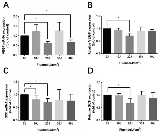 The expression of VEGF and SCF in HMEC-1 after 590 nm LED irradiation. (A,B) The synthesis and release of VEGF in HMEC-1 detected by RT-qPCR and ELISA after 590 nm LED irradiation (0–40 J/cm2, 24 h). (C,D) SCF synthesis and secretion of irradiated HMEC-1 48 h later. Data of treatment groups are normalized to the control and independent experiment results are expressed as means ± SD. (A,B) n = 3; (C,D) n = 5. *, p < 0.05. VEGF, vascular endothelial growth factor; SCF, stem cell factor.