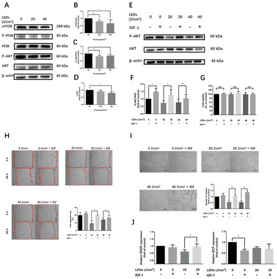 590 nm LED inhibited angiogenesis of HMEC-1 predominantly via AKT/PI3K/mTOR pathway. (A–D) The phosphorylation level of AKT/PI3K/mTOR pathway after LED illumination (20, 40 J/cm2, 0.5 h). (E,F) The phosphorylation level of AKT after LED irradiation (20, 40 J/cm2) alone or pretreated with IGF-1 (50 ng/mL, 2 h). (G) Cell viability of irradiated cells or with IGF-1 pretreatment. (H) Cell migration (48 h) of wound healing assay after LED illumination alone or pretreated with IGF-1. Bar, 100 μm. (I) Number of meshes (8 h) of HMEC-1 after LED irradiation alone or with IGF-1 pretreatment. Bar, 100 μm. (J) The secretion of VEGF and SCF from cells irradiated by 20 J/cm2 LED alone or with IGF-1 pretreatment detected by ELISA. (B–D,F,G,I,J) Results of irradiated groups are normalized to the control. Data are shown as means ± SD. (A–F) n = 5; (G–J) n = 3. *, p < 0.05; **, p < 0.01. LED, light-emitting diodes; IGF-1, insulin-like growth factor 1; VEGF, vascular endothelial growth factor; SCF, stem cell factor; n.s., no significance.