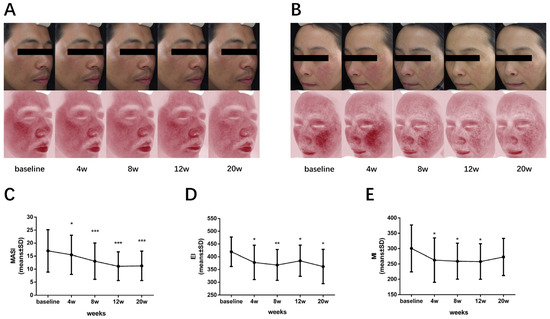 Improvement of hyperpigmentation and erythema in melasma patients after 590 nm LED light therapy. (A,B) Representative photographs (upper panel) and VISIA images (lower panel) of two melasma patients, showing significant improvement of hyperpigmentation and erythema after phototherapy. The change in mean MASI score (C), EI (D) and MI (E) of all patients enrolled during the course, shown as means ± SD. n = 10. *, p < 0.05; **, p < 0.01; ***, p < 0.001. MASI, melasma area severity index; EI, erythema index; MI, melanin index.