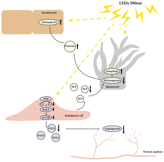 Multiple effects of 590 nm LED photobiomodulation on the microenvironment of skin. 590 nm LED alleviated angiogenesis through inhibiting cell migration, tube formation and VEGF release in endothelial cells, predominantly via the downregulation of the AKT/PI3K/mTOR pathway. In addition, LED suppressed melanogenesis via inducing autophagy in melanocytes, upregulating the H19/miR-675 axis and its exosome in keratinocytes, probably through decreasing the secretion of SCF in endothelial cells. LED, light-emitting diodes; VEGF, vascular endothelial growth factor; SCF, stem cell factor.