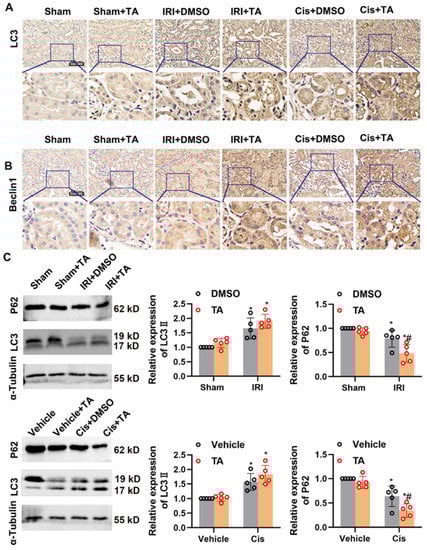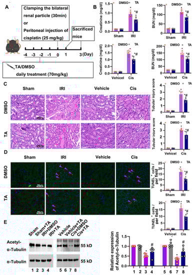 Male C57BL/6 mice (20–23 g) were purchased from the Experimental Animal Center of China Three Gorges University (Yichang, China). Renal tubule (RT)-Atg7-KO mouse model was established by breeding Atg7 flox/flox mice [] with KSP 1.3-Cre transgenic mice (Jackson lab No. 012237). C57BL/6-Tg (CAG/RFP/EGFP/Map1LC3B) 1 Hill/J autophagy reporter mice were obtained from the Jackson Laboratory (Strain No. 027139). All the mice were kept at a constant temperature (19–21 °C) in a 12 h cycle of light and shade, and each mouse had free access to food and water. To develop mouse renal IR models, we clamped bilateral renal pedicles for 30 min. Sham mice underwent the same surgical procedure without clamping. To develop a mouse model of cisplatin-induced AKI, the animals were injected intraperitoneally with a single dose of cisplatin (20 mg/kg) or normal saline. To study the effect of the HDAC6 inhibitor TA on AKI, TA (70 mg/kg) in 7.5% DMSO was given intraperitoneally immediately after cisplatin injection and then administered daily. The sham group was injected with an equal volume of DMSO as a control. Five mice were used in each group. Mice were killed 24 h after ischemia/reperfusion and 72 h after cisplatin injection. To further validate the effect of TA on autophagy in cisplatin-induced AKI, autophagy reporter mice (CAG/RFP/EGFP/Map1LC3B) were developed in mouse renal ischemia and cisplatin-induced AKI models. Kidney samples were harvested for protein analysis and histological examination. Blood was taken for the measurement of serum creatinine and blood urea nitrogen (BUN). The animal protocol was reviewed and approved by the Institutional Animal Care and Use Committee at Three Gorges University, China.