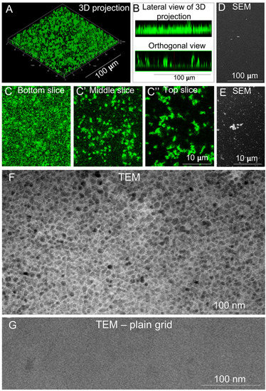 Human recombinant LN521 (Biolamina, Sundbyberg, Sweden) was diluted to 20 µg/mL in acidic buffer (20 mM sodium acetate, pH 4.0) containing 1 mM CaCl2. Drops containing 10 μL were placed on glass coverslips and incubated for 12 h, after which they were fixed in either 4% paraformaldehyde for immunolabeling or in Karnowsky reagent (4% paraformaldehyde and 0.5% glutaraldehyde in 0.1 M cacodylate buffer, pH 7.2) for 2 h for scanning electron microscopy (SEM). For immunolabeling, samples were incubated with rabbit polyclonal anti-LM antibody (1:50; Millipore-Sigma, St. Louis, MO, USA) and then with Alexa Fluor 555 anti-rabbit IgG (1:300, Thermo Fisher Scientific, Waltham, MA, USA). Confocal fluorescence images were obtained using a Zeiss Elyra PS1. For SEM, dehydrated samples dried with critical point drying were coated with a thin layer of gold sputter and visualized by using a JEOL JSM6300 scanning electron microscope. For transmission electron microscopy (TEM), 3 μL of polyLN521 were added to 300 mesh Cu-grids (Ted Pella Inc., Redding, CA, USA) that were previously glow-discharged for 180 s at 15 mA (Ted Pella, PELCO easiGlow™). After 30 min, the excess liquid was removed, and 1% uranyl acetate was added to samples for contrasting. Samples were analyzed using a 120-kV transmission electron microscope (Hitachi HT 7800, Japan).