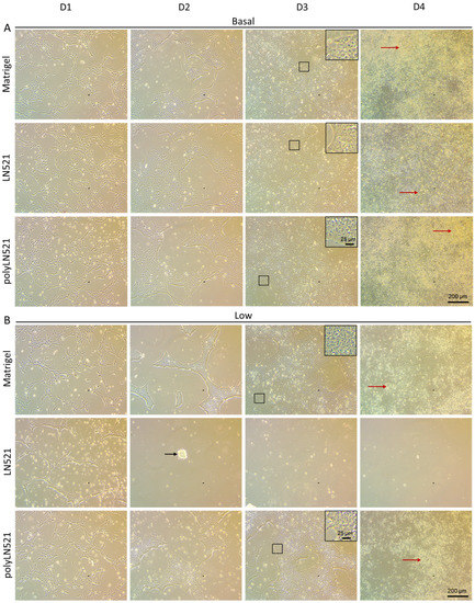 Expansion of human induced pluripotent stem cells (hiPSCs) under different coating conditions. (A) Representative bright-field images showing hiPSCs cultivated on basal-Matrigel, basal-LN521, and basal-polyLN521 from day 1 to day 4. (B) Representative bright-field images showing hiPSCs cultivated on low-Matrigel, low-LN521, and low-polyLN521 from day 1 to day 4. Insets represent cells with high nuclei to cytoplasm ratios. Red arrows indicate healthy colonies. Black arrow indicates dying cells.