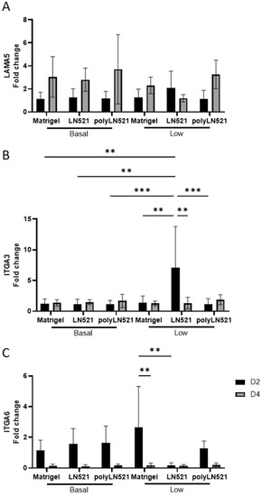 Gene expression indicative of extracellular matrix–cell interactions on days 2 and 4 in human induced pluripotent stem cells (hiPSCs) cultivated on coating systems with basal and low concentrations of Matrigel, LN521, or polyLN521. (A) Expression of LAMA5. (B) Expression of ITGA3. (C) Expression of ITGA6. n = 6 at day 2, n = 5 at day 4. ** p < 0.01; *** p < 0.001.