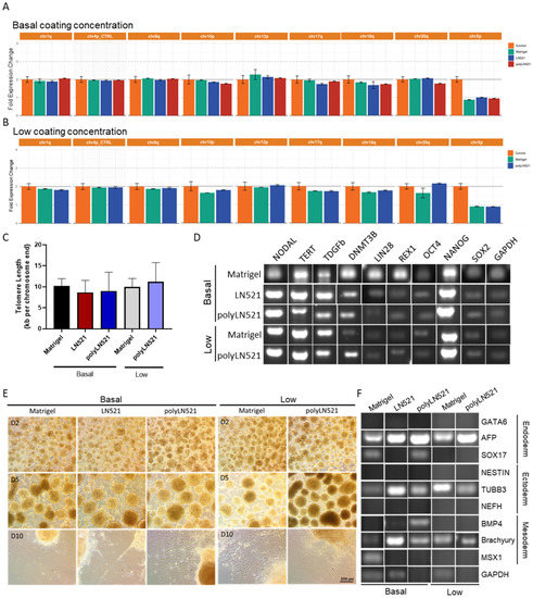 Characterization of pluripotency in human induced pluripotent stem cells (hiPSCs) cultivated on polyLN521. (A,B) Genetic screening analysis: quantitative PCR (qPCR) for Chr 1q, Chr 4p, Chr 8q, Chr 10p, Chr 12p, Chr 18q, Chr 20q and Chr Xp from cells cultivated on basal-Matrigel, basal-LN521, and basal-polyLN521 ((A), n = 3) or low-Matrigel, low-LN521, and low-polyLN521 ((B), n = 3). (C) Telomere length of hiPSCs (n = 4). (D) Pluripotent gene expression in hiPSCs. (E) Representative bright-field images showing the spontaneous differentiation of iPSCs on day 2, 5 and 10 after the cells were cultivated on basal- or low-Matrigel, basal- or low-LN521 and basal- or low-polyLN521. (F) Gene expression in the endoderm, ectoderm, and mesoderm of hiPSCs cultivated on basal- or low-Matrigel, basal- or low-LN521 and basal- or low-polyLN521.