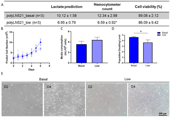 Large-scale expansion of human induced pluripotent stem cells (hiPSCs) using polyLN521. (A) Comparison between lactate-predicted and hemocytometer-counted cells harvested from the quantum expansion system (QES) after 6 days of expansion (data expressed in millions of cells). * p < 0.05, hemocytometer count for basal-polyLN521 vs. low-polyLN521. (B–D) Large-scale expansion characterization showing the lactate-predicted cell number (B), media consumption (C) and population-doubling level (D) of hiPSCs during expansion in QES on basal- and low-polyLN521 substrates. (E) Bright-field images of hiPSCs cultivated on basal-polyLN521 and low-polyLN521 after harvesting from the QES. * p < 0.05.