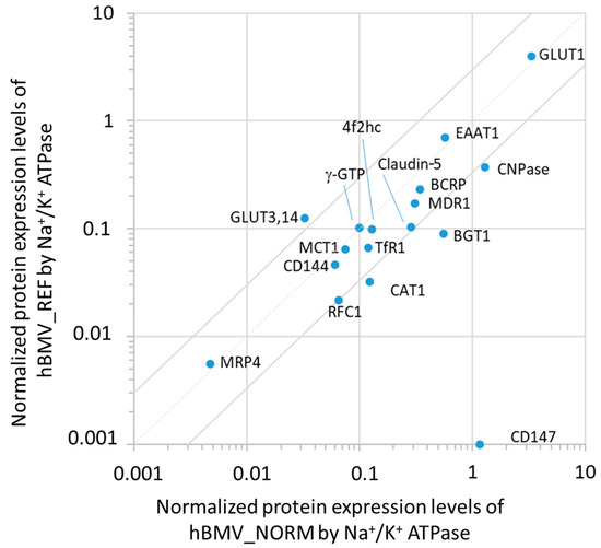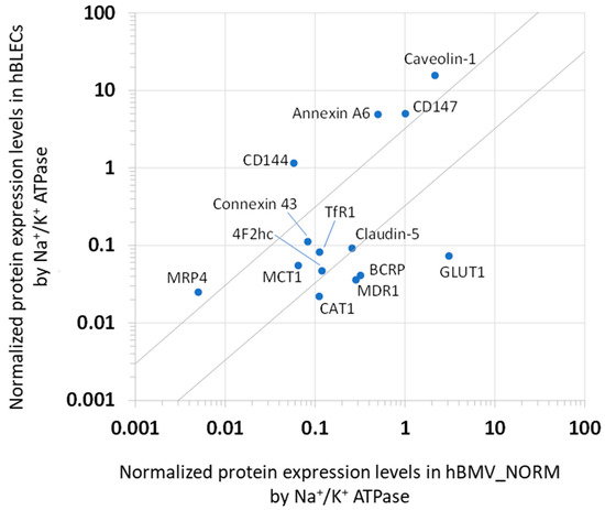 Comparison of the normalized protein expression levels in human brain-like endothelial cells (hBLECs) with those in the isolated human brain microvessels obtained from the two independent donors with no pathology in this study (hBMV_NORM). The protein expression amounts in the whole-cell lysates of hBLECs and hBMV_NORM were normalized by the level of Na+/K+ ATPase. The data on the protein expression levels are cited in Table 1. The grey lines represent 3-fold differences.