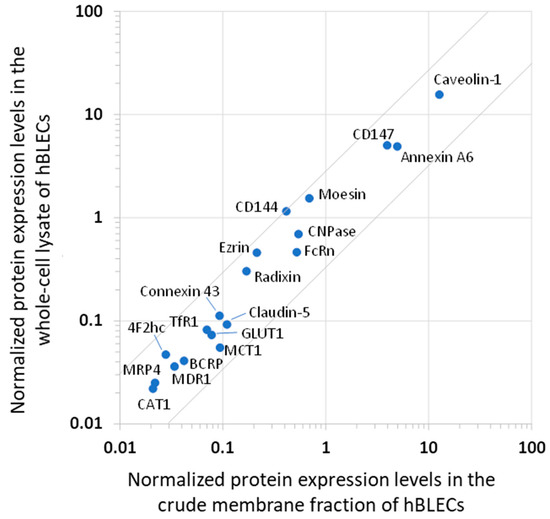 Comparison of the normalized protein expression levels of the crude membrane fraction and whole-cell lysate of human brain-like endothelial cells (hBLECs). The protein expression amounts were normalized by the level of Na+/K+ ATPase. The data on the protein expression levels are cited from Table 1. The grey lines represent 3-fold differences.
