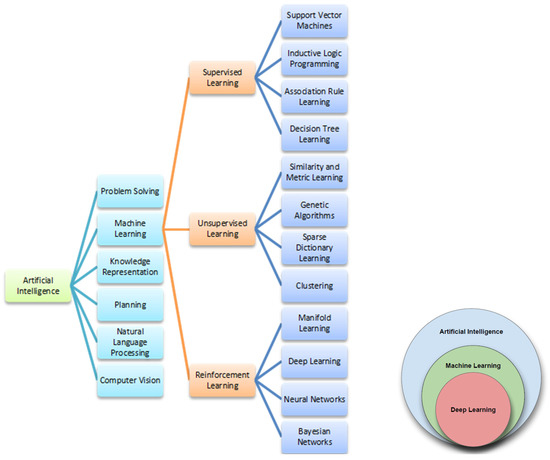AI main fields are depicted in Figure 1. Machine learning is the heart of AI, and its more promising research area is represented by so-called deep learning, an evolution of the artificial neural network basic approach.