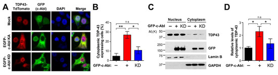 c-Abl increases cytoplasmic distribution of endogenous TDP-43. (A) Immunocytochemical analyses of c-Abl and TDP-43. GFP-c-Abl KA (green) or GFP-c-Abl KD and TDP-43-TdTomato (red) were co-expressed in SH-SY5Y cells. (B) Quantification of the percentage of cells expressing cytoplasmic TDP-43 (n = 4–12). (C) Expression of kinase active (KA) form of c-Abl increases the accumulation of TDP-43 in the cytoplasm, but not in expression of kinase dead (KD) form of c-Abl. (D) Quantification of the levels of cytoplasmic TDP-43 in the c-Abl KA and KD–expressing cells (n = 3). Statistical significance was determined by using one-way ANOVA with Tukey’s correction; * p < 0.05, ** p < 0.01, n.s. = non-significance.