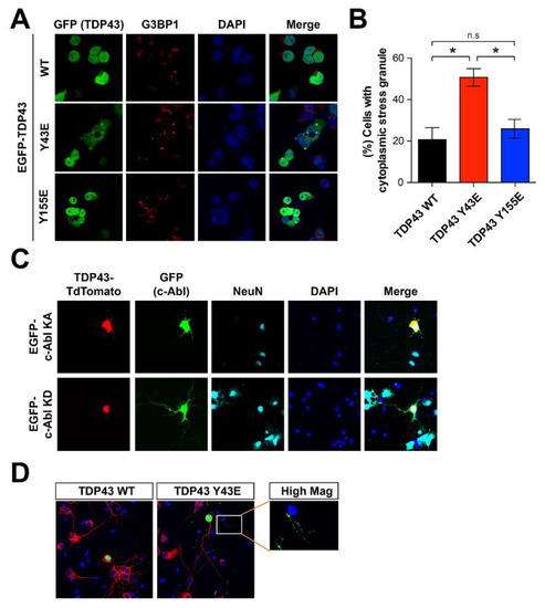 Since the accumulation of cytoplasmic TDP-43 has been physiologically associated with stress granules under the oxidative and osmotic stress [31], we tested whether the accumulation of cytoplasmic of TDP-43 induced by c-Abl regulates the formation of stress granule. To determine the number of stress granules, we stained the G3BP1, which is required for normal stress granule assembly, in the SH-SY5Y cells expressing either TDP-43 WT or phosphor-mimetic mutant (Y43E and Y155E). TDP-43 Y43E mutant increased the number of G3BP1-positive stress granules compared with TDP-43 WT and Y155E mutant (Figure 4A,B). The accumulation of cytoplasmic TDP-43 was also observed in primary cortical neurons with lenti-viral transduction of c-Abl KA, but not by c-Abl KD (Figure 4C). Moreover, cortical neurons expressing TDP-43 Y43E phosphor-mimetic mutant showed the cytoplasmic inclusion of TDP-43 in the cell body and neurites compared to TDP-43 WT expressing neurons (Figure 4D).