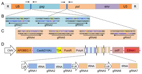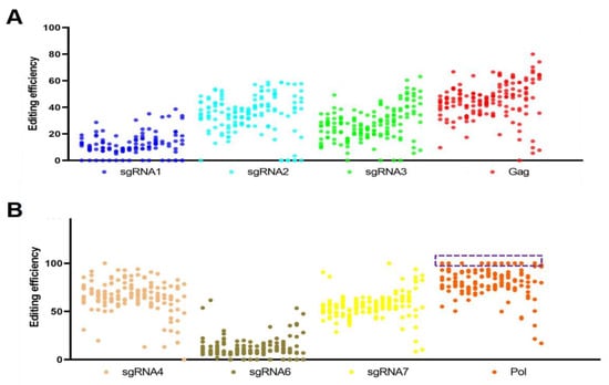 For the Mi-seq sequencing, PCR was performed in 50 μL volumes comprising 1 μL of the template, 1.5 μL of each 10 μM primer, and 25 μL 2× KOD OneTM PCR master mix with the following thermal cycler conditions: 98 °C for 3 min; 30 cycles of 98 °C for 10 s, 60 °C for 5 s, and 68 °C for 1 s; followed by 72 °C for 5 min as a final extension; and held at 12 °C. The primers used for amplification of the gag region were M-gag-F1 and M-gag-R1. The primers used for amplification of the pol region were M-pol-F1 and M-pol-R1. All the amplified products in different target regions were separated in 1.5% agarose gels with 1× TAE buffer, and the target bands were cut for extraction using a HiPure Gel Pure DNA Mini kit (Magen). The purified DNA products were deep-sequenced and assayed using Hi-TOM platform []. The protospacer sequences in the reads were investigated to identify C-to-T and G-to-A point mutations, and indels. Primers used for genomic PCR and sequencing are listed in Supplementary Table S3.