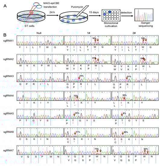 The ST cell lines were fibroblast-like cells that were isolated from the testis of a male pig and were purchased from Procell (CL0219). This cell line was cultured in Dulbecco’s modified Eagle’s medium (DMEM, HyClone, Waltham, MA, USA) supplemented with 10% fetal bovine serum (FBS, Gibco), 1% nonessential amino acids (NEAA, Gibco, Waltham, MA, USA), 2 mM GlutaMAX (Gibco), and 1 mM sodium pyruvate (Gibco). All cells were cultured at 37 °C with 5% CO2. ST cells were cultured in 10 cm dishes and transfected the next day at approximately 70% confluency. For electroporation, the cells were digested with 0.05% trypsin (Gibco) and collected by centrifugation. Then, the collected cells were electroporated with MAIO-epiCBE (30 μg) at 1230 V, 10 ms, and 3 pulses using the Neon™ transfection system (Life Technology, Carlsbad, CA, USA). Cells transfected with null (the null sgRNA sequence was as follow: CGCTTCCGCGGCCCGTTCAA) were used as a negative control.