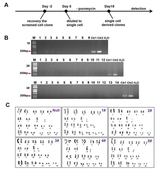 To determine whether the MAIO-epiCBE vectors could be removed from the host cells, three ST cell clones were chosen for further analysis. They were disassociated for monoclonal cultivation and cultured for 15 days after puromycin was removed (Figure 4A). None of the subclones were detected to have foreign vectors after the removal of puromycin (Figure 4B). Moreover, five clones were chosen for karyotype analysis. Compared with the null cells, the modified cells did not induce any new detectable karyotype abnormalities (Figure 4C). In summary, the MAIO-epiCBE plasmid did not integrate into the host genome and influence the karyotype of modified cells.