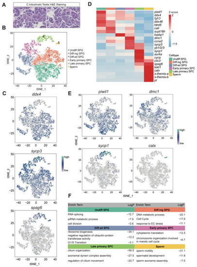 Single-cell transcriptome analysis identified germ cells of C. intestinalis testis. (A) Histological and morphology of C. intestinalis testes by H&E staining. Left: scale bar = 100 µm; right: scale bar = 50 µm. (B) t-SNE and clustering analysis of scRNA-seq data from C. intestinalis testis germ cells (n = 6832). Different cell types are shown in distinct colors. The 6 cluster identities were assigned based on marker gene expression shown in (C–E). Undiff SPG: undifferentiated spermatogonia; Diff.ing SPG: differentiating spermatogonia; Diff.ed SPG: differentiated SPG; SPC: spermatocyte. (C) t-SNE plot showing the expression of genes ddx4, sycp3 and spag6. (D) Heatmap showing the expression of marker genes in different cell types. Differential gene-expression levels utilize a Z score, which represents the variance from the mean, as defined in the color key in the top-right corner. (E) t-SNE plot showing the expression of major marker genes. (F) Enriched terms for DEGs are shown for germ-cell types (p values are shown).