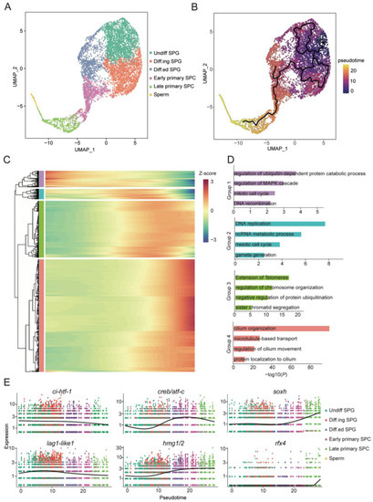In addition, we analyzed the global expression pattern of genes during spermatogenesis. We identified 1777 genes that varied with the pseudo-developmental order of germ cells, revealing four distinct gene groups (Figure 2C). As expected, the term “mitotic cell cycle” was enriched in group1, “meiotic cell cycle” in group2, and “cilium organization” in group4 (Figure 2D). This result shows the transition of spermatogenesis from mitosis to meiosis and the eventual generation of flagellar motility-dependent sperm. Furthermore, we also found some other enriched terms, such as “regulation of MAPK cascade” in group1, “ncRNA metabolic process” in group2, and “extension of telomeres” in group3, which play a broad role in spermatogenesis [33,34,35] (Figure 2D). The spermatogenesis of C. intestinalis is also regulated by some transcription factors. We showed that the transcription factors that are differentially expressed across stages (Figure 2E). The expression of ci-htf-1 decreased gradually during spermatogenesis. Lag1-like1 was up-regulated from Undiff SPG to Diff.ing SPG. The CREB/ATF family members creb/atf-c and high-mobility histones hmg1/2 were up-regulated from the Diff.ing SPG until they differentiated into Early primary SPC [36]. The expression of soxh, which is involved in male germ-cell development, gradually increased after entering Early primary SPC. Rfx4 was highly expressed at the end of spermatogenesis (Figure 2E). Our results provide a reference for the detailed functional study of these transcription factors in spermatogenesis.