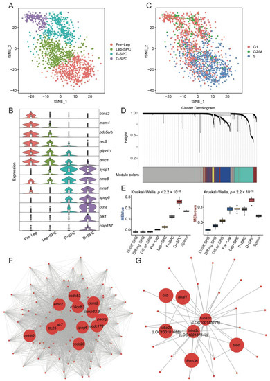 Identification of four meiotic cell populations in C. intestinalis. (A) t-SNE of spermatocyte re-clustering. Different colors correspond to 4 different stages of spermatocyte subsets. Pre-LEP: preleptotene spermatocytes; Lep-SPC: leptotene spermatocytes; P-SPC: pachytene spermatocytes; D-SPC: diplotene spermatocytes. (B) Vlnplot of the normalized expression of meiotic marker genes. (C) t-SNE plot showing the cell cycle status of spermatocytes. (D) The clustering dendrogram of the weighted gene coexpression network. The resulting modules are depicted in different colors: blue, turquoise, yellow, brown, and gray. (E) Boxplot showing the correlation of the blue module and brown module with all germ-cell types. (F) Interactions of the top 100 genes in the blue module, with the top 12 hub genes highlighted. (G) Interactions of all genes in brown module, with the top 7 hub genes highlighted.