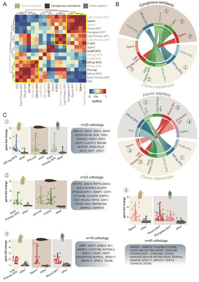Further, we delved into cell-type comparisons between pairs of species. The results showed that C. intestinalis had multiple germ-cell similarities to C. semilaevis and H. sapiens, respectively, and had specific coexpression of orthologous genes (Figure 4B,C). For instance, the Diff.ing SPG of C. intestinalis were more similar to the Pre-Lep of C. semilaevis as well as to the Early primary SPC of H. sapiens (Figure 4B). The common feature was the high expression of 20 orthologs, including most cell-cycle-related genes, such as the chromosome structure maintenance (SMC) family members SMC1A, SMC2, SMC3, and SMC4 (Figure 4C). Early primary SPC of C. intestinalis were more similar to those of C. semilaevis, with a total of 23 expressed orthologous genes, including the known meiotic marker SYCP3 (Figure 4B,C). There were many orthologous genes shared by the sperms of C. intestinalis and the spermatids of H. sapiens (Figure 4C). However, we also observed some many-to-many germ-cell similarities across species, a pattern that illustrates the evolution of diversity in germ-cell lineages.