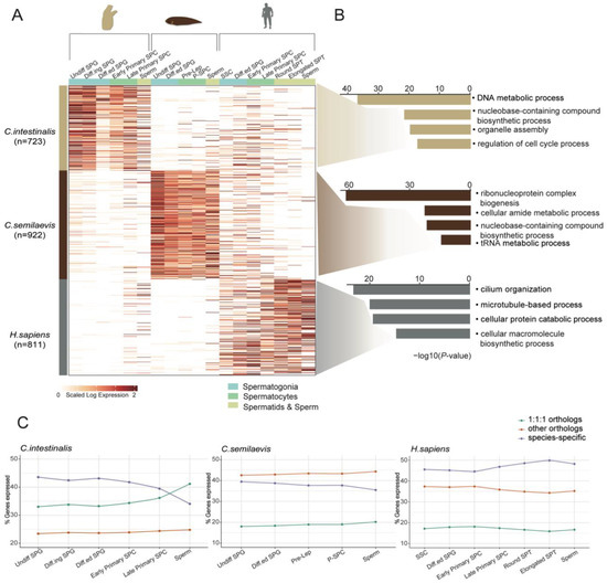 Species-specific evolutionary features of chordate spermatogenesis. (A) Heatmap showing the expression of differential gene orthologs among germ cells of the three species. (B) GO terms for the genes described in Figure 5A. (C) Line plot depicting the percentage of gene classes that are expressed in each species over the course of spermatogenesis, e.g., 1-1-1 orthologous genes (green), other orthologs (orange), and species-specific genes (blue).