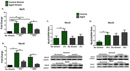 The effects of mechanical loading on the myogenic capacity of the proliferating aged and control myoblasts were examined by the expression levels of the early myogenic differentiation factors Myf5 and MyoD in the C2C12 cells. We found that in the aged myoblasts, only the low strain (2%) stretching protocol induced a significant increase in the expression of Myf5, in contrast with the control cells, in which both 2% and 15% elongation protocols resulted in significant upregulation of Myf5 (Figure 2A). Similarly, both loading protocols resulted in significant increases in the expression of the MyoD protein only in the control cells (Figure 2C,D), while at the transcription level, these increases were significantly higher compared with the responses of the aged cells to stretching (Figure 2B).