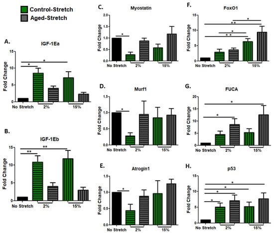 Mechanical loading-induced transcriptional changes in IGF-1 isoforms, muscle atrophy, and pro-apoptotic factors. Analysis of (A) IGF-1Ea, (B) IGF-1Eb, (C) Myostatin, (D) Murf1, (E) Atrogin1, (F) FoxO1, (G) FUCA, and (H) p53 mRNA expression in stretched and non-stretched aged and control C2C12 myoblasts. The transcriptional responses of the genes of interest in the stretched cells were normalized to the corresponding GAPDH mRNA and are expressed as fold changes compared with the no stretch condition (mean ± SE of three independent experiments performed in triplicate; significantly different: * p < 0.05, ** p < 0.01).