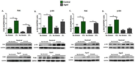 This study examined the activation of the mechanosensitive pathways by mechanical stretching, not only in the proliferating myoblasts, but also in differentiated (day 10 of differentiation) aged and control myotubes. Again, we investigated the potential effects of mechanical loading on FAK expression and the activation of its downstream effector Akt as a signaling protein in the PI3–kinase–Akt pathway, which is essential for muscle cell differentiation and survival. Similar responses to mechanical stretching were found in both the aged and the control myotubes, where a significant upregulation of FAK was induced by the low strain (2%) and the high (15%) strain loading protocol (Figure 4A,C). Interestingly, however, a significant activation (phosphorylation) of the signaling protein Akt was only observed in the control and not in the aged myotubes, regardless of the strain of mechanical loading (Figure 4B,D).