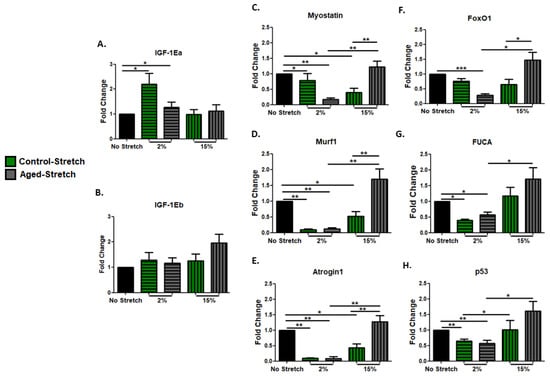 Mechanical loading-induced transcriptional changes of IGF-1 isoforms, muscle atrophy, and pro-apoptotic factors. Analysis of (A) IGF-1Ea, (B) IGF-1Eb, (C) Myostatin, (D) Murf1, (E) Atrogin1, (F) FoxO1, (G) FUCA, and (H) p53 mRNA expression in stretched and non-stretched aged and control C2C12 myotubes. The transcriptional responses of the genes of interest in the stretched myotubes were normalized to the corresponding GAPDH and are expressed as fold changes compared with the no stretch condition (mean ± SE of three independent experiments performed in triplicate; significantly different: * p < 0.05, ** p < 0.01, *** p < 0.001).