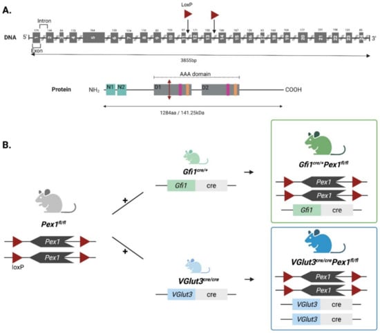 Generation of new organ specific Pex1 knockout mice. (A) Schematic of Pex1 gene and Pex1 protein. LoxP sites (red triangle) were inserted inside the introns 11 and 13 of the Pex1 gene. Excision of exons 12 and 13, upon Cre recombination, leads to the production of a truncated protein (red vertical arrow). The Pex1 protein is composed of two N-terminal domains (N1 and N2) and two functional AAA domains (D1 and D2). The conserved Walker motifs domains into AAA domains are indicated (Walker A motifs: magenta and Walker B motifs: orange); (B) Breeding scheme for generating Gfi1cre/+Pex1fl/fl mice line (Cre expressed in inner and outer hair cells around E15.5) and VGlut3cre/crePex1fl/fl mouse line (Cre expressed in inner hair cells around birth). Pex1fl/fl mice were used as a control. Created with BioRender.com (Accessed date: 6 December 2022).