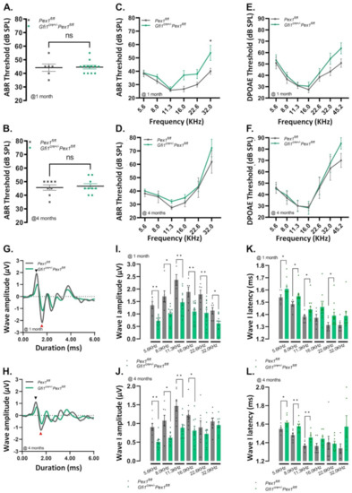 Decrease of the wave I ABR amplitude is observed in Gfi1cre/+Pex1fl/fl mice. (A,B) Click ABR recordings on Pex1fl/fl (grey) and Gfi1cre/+Pex1fl/fl (green) mice at 1 month (Table S1; mean ± S.E.M. ns p = 0.9334, Mann–Whitney test) (A) and 4 months (Table S1; mean ± S.E.M. ns p = 0.9638, Mann–Whitney test) (B); (C,D) Pure-tone ABR recordings as a function of frequencies (kHz) on Pex1fl/fl (grey) and Gfi1cre/+Pex1fl/fl (green) mice at 1 month (Table S1; mean ± S.E.M. 5.6 kHz: ns p > 0.999, 8.0 kHz: ns p > 0.999, 11.3 kHz: ns p > 0.999, 16.0 kHz: ns p = 0.213, 22.6 kHz: ns p = 0.631, 32.0 kHz: * p = 0.033—2way ANOVA Bonferroni’s multi-comparison test) (C) and 4 months (Table S1; mean ± S.E.M. 5.6kHz: ns p > 0.999, 8.0 kHz: ns p > 0.999, 11.3 kHz: ns p > 0.999, 16.0 kHz: ns p > 0.999, 22.6 kHz: ns p > 0.999, 32.0 kHz: ns P = 0.551—2way ANOVA Bonferroni’s multi-comparison test) (D); (E,F) Distortion-product otoacoustic emissions (DPOAEs) recordings as a function of frequencies (kHz) on Pex1fl/fl (grey) and Gfi1cre/+Pex1fl/fl (green) mice at 1 month (Table S2; mean ± S.E.M. 5.6 kHz: ns p > 0.999, 8.0 kHz: ns p > 0.999, 11.3 kHz: ns p > 0.999, 16.0 kHz: ns p > 0.999, 22.6 kHz: ns p > 0.999, 32.0 kHz: ns p = 0.557, 45.2 kHz: ns p = 0.312—2way ANOVA Bonferroni’s multi-comparison test) (E) and 4 months (Table S2; mean ± S.E.M. 5.6kHz: ns p > 0.999, 8.0 kHz: ns p > 0.999, 11.3 kHz: ns p > 0.999, 16.0 kHz: ns p > 0.999, 22.6 kHz: ns p > 0.999, 32.0 kHz: ns p > 0.999, 45.2 kHz: ns p = 0.300—2way ANOVA Bonferroni’s multi-comparison test) (F); (G,H) Average of individual click ABR wave traces recorded on Pex1fl/fl (grey) and Gfi1cre/+Pex1fl/fl (green) mice at 1 month (G) and 4 months (H). Black arrowhead indicates the positive peak of wave I (P1) and the red arrowhead indicates the negative peak of the wave I (N1); (I,J) Average of highest intensity tested (90, 80, 70 dB SPL) of wave I amplitude (N1-P1) on pure tones recording from 5.6 to 32.0 kHz at 1 month (Table S3; mean ± S.E.M. 5.6 kHz: ** p = 0.0054, 8.0 kHz: * p = 0.0235, 11.3 kHz: ** p = 0.0064, 16.0 kHz: ** p = 0.0084, 22.6 kHz: ** p = 0.0049, 32.0 kHz: * p = 0.0109—unpaired t-test with Welch’s correction); (I) and 4 months (Table S3; mean ± S.E.M. 5.6 kHz: ** p = 0.0034, 8.0 kHz: * p = 0.0144, 11.3 kHz: ** p = 0.0042, 16.0 kHz: * p = 0.0293, 22.6 kHz: ns p = 0.4393, 32.0 kHz: ns p = 0.4436—unpaired t-test with Welch’s correction) (J) on Pex1fl/fl (grey) and Gfi1cre/+Pex1fl/fl (green) mice; (K,L) Measures of the wave I latency on pure tones recorded from 5.6 to 32.0 kHz at 1 month (Table S4; mean ± S.E.M. 5.6 kHz: * p = 0.0341, 8.0 kHz: * p = 0.0196, 11.3 kHz: * p = 0.0451, 16.0 kHz: ns p = 0.0502, 22.6 kHz: * p = 0.0417, 32.0 kHz: ns p = 0.0807—unpaired t-test with Welch’s correction) (K) and 4 months (Table S4; mean ± S.E.M. 5.6 kHz: * p = 0.0261, 8.0 kHz: ** p = 0.0034, 11.3 kHz: ** p = 0.0024, 16.0 kHz: ns p = 0.0547, 22.6 kHz: ns p = 0.8970, 32.0 kHz: ns p = 0.1122—unpaired t-test with Welch’s correction) (L) on Pex1fl/fl (grey) and Gfi1cre/+Pex1fl/fl (green) mice. Averages the highest intensity tested (90, 80, 70dB SLP); 1 month: Pex1fl/fl (n = 6), Gfi1cre/+Pex1fl/fl (n = 10–12), 4 months—Pex1fl/fl (n = 8), Gfi1cre/+Pex1fl/fl (n = 6–9).