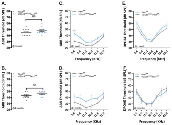 Mild hearing loss is observed in VGlut3cre/crePex1fl/fl mice. (A,B) Click ABR recordings on Pex1fl/fl (grey) and VGlut3cre/crePex1fl/fl (blue) mice at 1 month (Table S5; mean ± S.E.M. ns p = 0.2243, Mann–Whitney test) (A) and 4 months (Table S5; mean ± S.E.M. ns p = 0.2962, Mann–Whitney test) (B); (C,D) Pure-tone ABR recordings as a function of frequencies (kHz) on Pex1fl/fl (grey) and VGlut3cre/crePex1fl/fl (blue) mice at 1 month (Table S5; mean ± S.E.M. 5.6 kHz: **** p = 0.00007, 8.0 kHz: * p = 0.01236, 11.3 kHz: ns p = 0.4983, 16.0 kHz: ns p = 0.1559, 22.6 kHz: ns p = 0.2691, 32.0 kHz: ns p > 0.999—2 way ANOVA Bonferroni’s multi-comparison test) (C) and 4 months (Table S5; mean ± S.E.M. 5.6 kHz: ns p = 0.1421, 8.0 kHz: * p = 0.0382, 11.3 kHz: ns p = 0.0604, 16.0 kHz: * p = 0.0199, 22.6 kHz: ns p = 0.2271, 32.0KHz: ns p = 0.8029—2way ANOVA Bonferroni’s multi-comparison test) (D); (E,F) Distortion-product otoacoustic emissions (DPOAEs) recordings as a function of frequencies (kHz) on Pex1fl/fl (grey) and VGlut3cre/crePex1fl/fl (blue) mice at 1 month (Table S6; mean ± S.E.M. 5.6 kHz: ns p = 0.5657, 8.0 kHz: ns p > 0.999, 11.3 kHz: ns p > 0.999, 16.0 kHz: ns p > 0.999, 22.6 kHz: ns p > 0.999, 32.0 kHz: ns p = 0.9486, 45.2 kHz: ns p > 0.999—2 way ANOVA Bonferroni’s multi-comparison test) (E) and 4 months (Table S6; mean ± S.E.M. 5.6 kHz: ns p > 0.999, 8.0 kHz: ns p > 0.999, 11.3 kHz: ns p > 0.999, 16.0 kHz: ns p > 0.999, 22.6 kHz: ns p > 0.999, 32.0 kHz: ns p = 0.8351, 45.2 kHz: ns p > 0.999—2 way ANOVA Bonferroni’s multi-comparison test) (F). 1 month: Pex1fl/fl (n = 17), VGlut3cre/crePex1fl/fl (n = 12), 4 months—Pex1fl/fl (n = 10), VGlut3cre/crePex1fl/fl (n = 9).