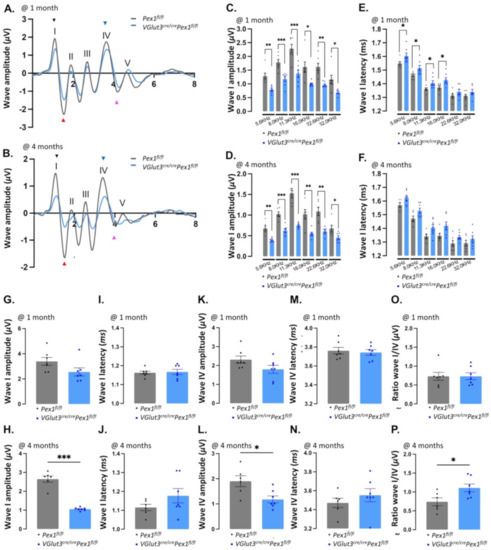 Wave I and IV amplitude are decreased in VGlut3cre/crePex1fl/fl. (A,B) Average of individual click ABR wave traces recorded on Pex1fl/fl (grey) and VGlut3cre/crePex1fl/fl (blue) mice at 1 month (A) and 4 months (B). Wave I, II, III, IV and V have been annotated. Black arrowhead indicates the positive peak of the wave I (P1), the red arrowhead indicates the negative peak of the wave I (N1), blue arrowhead indicate the positive peak of the wave IV (P4) and the pink arrowhead indicate the negative peak of the wave IV (N4). (C,D) Average of the wave I amplitude (N1-P1) on pure tones recorded from 5.6 to 32.0 kHz at 1 month (Table S7; mean ± S.E.M. 5.6 kHz: ** p = 0.0028, 8.0 kHz: *** p = 0.0009, 11.3 kHz: *** p = 0.0007, 16.0 kHz: * p = 0.0141, 22.6 kHz: ** p = 0.0022, 32.0 kHz: * p = 0.0213—unpaired t-test with Welch’s correction) (C) and 4 months (Table S7; mean ± S.E.M. 5.6 kHz: * p = 0.0048, 8.0 kHz: *** p = 0.0002, 11.3 kHz: *** p = 0.0009, 16.0 kHz: ** p = 0.0069, 22.6 kHz: ** p = 0.0036, 32.0 kHz: * p = 0.0368—unpaired t-test with Welch’s correction) (D) on Pex1fl/fl (grey) and VGlut3cre/crePex1fl/fl (blue) mice; (E,F) Average of the wave I latency on pure tones recorded from 5.6 to 32.0 kHz at 1 month (Table S8; mean ± S.E.M. 5.6 kHz: * p = 0.0210, 8.0 kHz: * p = 0.0390, 11.3 kHz: * p = 0.0175, 16.0 kHz: * p = 0.0146, 22.6 kHz: ns p = 0.2978, 32.0 kHz: ns p = 0.2477—Mann–Whitney test) (E) and 4 months (Table S8; mean ± S.E.M. 5.6 kHz: ns p = 0.0822, 8.0 kHz: ns p = 0.0629, 11.3 kHz: ns p = 0.0565, 16.0 kHz: ns p = 0.0542, 22.6 kHz: ns p = 0.1241, 32.0 kHz: ns p = 0.3910—Mann–Whitney test) (F) on Pex1fl/fl (grey) and VGlut3cre/crePex1fl/fl (blue) mice; (G,H) Average of wave I amplitude (N1-P1) on Click at 1 month (G) and 4 months (H) (Table S7; mean ± S.E.M. 1 month: ns p = 0.0842, 4 months: *** p = 0.0002—unpaired t-test with Welch’s correction) on Pex1fl/fl (grey) and VGlut3cre/crePex1fl/fl (blue) mice; (I,J) Average of the wave I latency on Click recording at 1 month (I) and 4 months (J) (Table S8; mean ± S.E.M.—1 month: ns p = 0.9825, 4 months: ns p = 0.3415—Mann–Whitney) on Pex1fl/fl (grey) and VGlut3cre/crePex1fl/fl (blue) mice; (K,L) Average of wave IV amplitude (N4-P4) on Click recording at 1 month (K) and 4 months (L) (Table S9; mean ± S.E.M.—1 month: ns p = 0.0943, 4 months: * p = 0.0217—unpaired t-test with Welch’s correction) on Pex1fl/fl (grey) and VGlut3cre/crePex1fl/fl (blue) mice; (M,N) Average of the wave IV latency on Click recording at 1 month (M) and 4 months (N) (Table S10; mean ± S.E.M. 1 month: ns p = 0.8269, 4 months: ns p = 0.1346—unpaired t-test with Welch’s correction) on Pex1fl/fl (grey) and VGlut3cre/crePex1fl/fl (blue) mice; (O,P) Ratio wave IV/I measured on Click recording at 1 month (O) and 4 months (P) (Table S11; mean ± S.E.M. -1 month: ns p = 0.9839, 4 months: * p = 0.0288—unpaired t-test with Welch’s correction) on Pex1fl/fl (grey) and VGlut3cre/crePex1fl/fl (blue) mice. Averages the highest intensity tested (90, 80, 70 dB SLP); 1 month: Pex1fl/fl (n = 7), VGlut3cre/crePex1fl/fl (n = 7), 4 months—Pex1fl/fl (n = 6), VGlut3cre/crePex1fl/fl (n = 7).