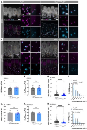 Accordingly, an increase in smaller ribbon synapses (from 0 to 0.25 μm3) was evident at both 8.0 and 22.6 kHz, respectively with ~16% and ~35% increase in VGlut3Cre/CrePex1fl/fl compared to control Pex1fl/fl mice (at 8.0 kHz: Pex1fl/fl: 37.23 %, n = 282 ribbons; VGlut3Cre/CrePex1fl/fl: 53.05%, n = 311 ribbons—at 22.6 kHz: Pex1fl/fl: 26.57 %, n = 286 ribbons; VGlut3Cre/CrePex1fl/fl: 60.98, n = 328 ribbons; Table S13; Figure 5I,J).