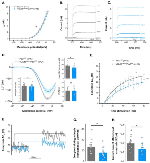 Next, we investigated changes in exocytosis and Ca2+ current in mature P21-P25 IHCs from Pex1 fl/fl and VGlut3Cre/CrePex1 fl/fl mice to determine if Pex1 disruption affects ribbon synapse function. Ca2+ currents are crucial to trigger fusion of the synaptic vesicles in the IHC synaptic active zone. Depolarization of IHC activates CaV1.3 Ca2+ channels. These channels are present in the synaptic active zone, forming tight clusters with ribbons that aggregate synaptic vesicles [31,32]. Whole-cell patch clamp recordings of IHCs demonstrate significant decrease of inward Ca2+ currents in VGlut3Cre/CrePex1fl/fl mice (Figure 6D; Table S14; Pex1fl/fl: 138.8 ± 6.3 pA—VGlut3cre/crePex1fl/fl: −118.4 ± 5.89 pA; unpaired t-test, * p = 0.025), with, however, no shift in the activation curve (Figure 6D; Table S14; Pex1fl/fl: 21.36 ± 0.67 mV—VGlut3cre/crePex1fl/fl: −21.27 ± 0.68 mV; unpaired t-test, ns p = 0.93).