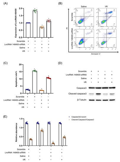 Next, we explored the function of lncRNA 148400 in ischemic injury. BUMPT cells were transfected with or without lncRNA 148400 siRNA and then treated with I/R (2 h each). The RT−qPCR showed that the expression level of lncRNA 148400 was markedly suppressed under basic and I/R treatment (Figure 2A). FCM results confirmed that lncRNA 148400 siRNA significantly suppressed I/R-induced cell apoptosis (Figure 2B,C). These results were similar to those of immunoblotting analysis for cleaved caspase−3 and caspase-3 (Figure 2D,E). These results indicated that lncRNA 148400 induces apoptosis in ischemic injury.