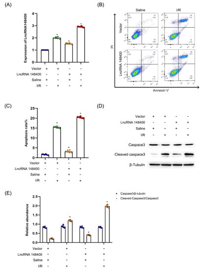 Although we found that lncRNA 148400 knockdown attenuated the apoptosis caused by I/R, the effect of lncRNA 148400 overexpression on apoptosis remains unclear. The overexpression of lncRNA 148400 not only enhanced the lncRNA 148400mRNA level (Figure 3A) but also increased the apoptosis and expression of cleaved caspase−3 in BUMPT cells under standard and I/R conditions (Figure 3B–E). Our data confirmed that lncRNA 148400 had a pro-apoptotic effect in renal ischemic injury.