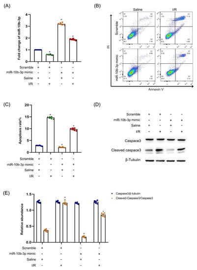 3.5. miR−10b−3p Protected against I/R-Induced Apoptosis